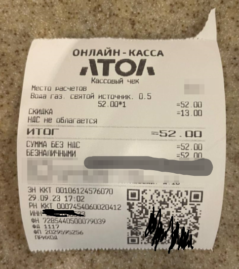 <?xml version="1.0" encoding="UTF-8"?> <CheckPackage> <Parameters CashierName="" OperationType="1" TaxationSystem="1" SaleAddress="14" SaleLocation=" " CustomerEmail="" CustomerPhone=""> <AgentData/> <VendorData/> <CustomerDetail/> <OperationalAttribute/> <IndustryAttribute/> </Parameters> <Positions> <FiscalString Name="Вода газ. святой источник, 0,5" Quantity="1" PriceWithDiscount="52" AmountWithDiscount="52" DiscountAmount="13" Department="1" VATRate="none" VATAmount="0" PaymentMethod="4" CalculationSubject="1" MeasureOfQuantity="0"> <GoodCodeData GS1.M="KDAxKTA0NjAzOTM0MDAwNzU1KDIxKTU0dG0lYm4hOVNyR0g="/> <AgentData/> <VendorData/> <IndustryAttribute/> </FiscalString> </Positions> <Payments Cash="0" ElectronicPayment="52" PrePayment="0" PostPayment="0" Barter="0"/> </CheckPackage> ![]() |