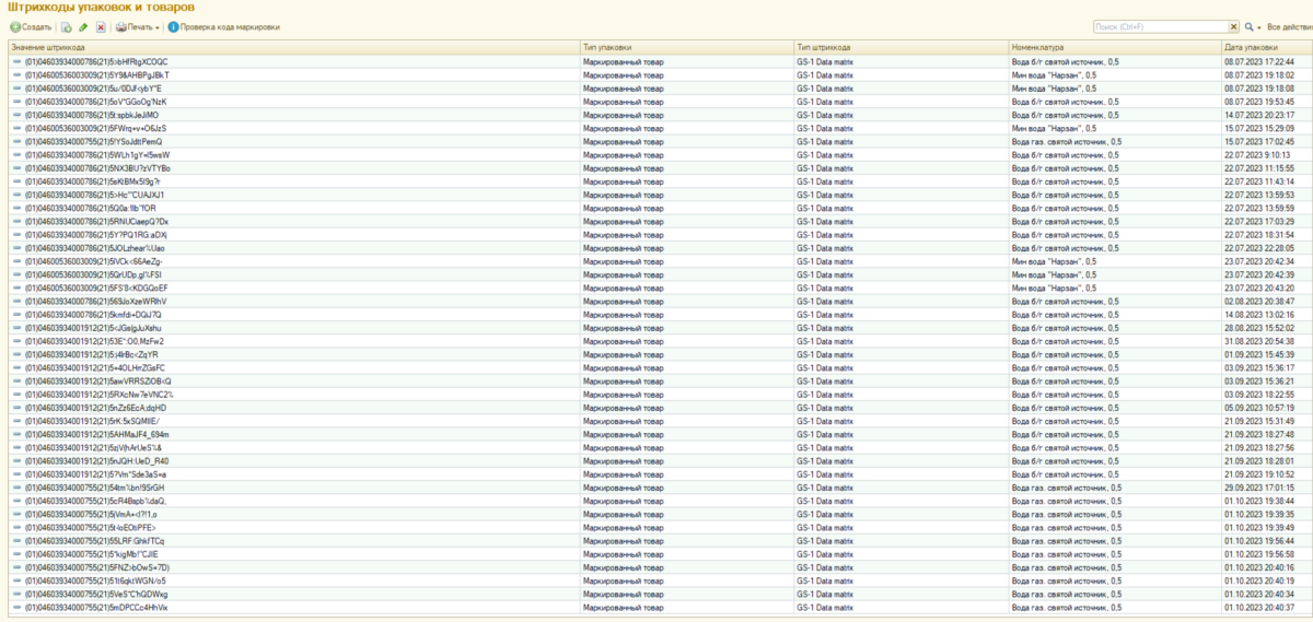 Возможные варианты: 1. Отдается код маркировки из поля справочника ШтрихкодыУпаковокТоваров ЗначениеШтрихкода. 2. Отдается код маркировки из поля ШтрихкодыУпаковокТоваров ЗначениеШтрихкодаБазе64. Если 1 - случай, то тогда понятно почему у меня затык. |