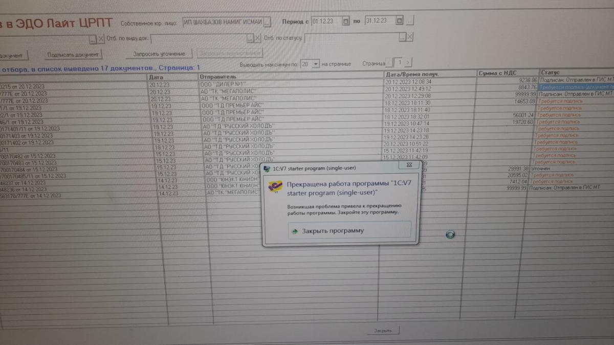 В продолжение закрытой: v7: Карлик (curl1c) и XML_DOM, вместе крашутся... В "боевой" у одного клиента периодически падает: ![]() Пока не понял отчего, но, тенденция явная - говорит, третья накладная подряд "схлопывает" 1С, при этом, подписание документа отрабатывает - после перезапуска 1С статус у этого "злополучного" документа становится "подписан", так, что, он отрабатывает, а падает именно на выводе результата запроса... Никакой XML_DOM в этой обработке не грузится, это точно, там давно вся работа с ХМЛ переделана на 1срр... Вообще, зная оператора этого клиента, могу допустить, что параллельно с обработкой ЭДО лайт, может быть запущено что-то из ЕГАИС, а там все на XML_DOM построено... Позвоню, попытаю... |