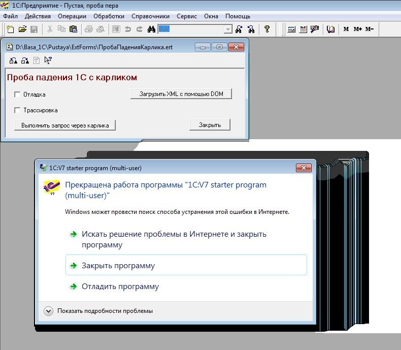 Я в обе процедуры - и в запрос, и в изменение галочек добавил в конец Карлик = 0; Пофик... Если перед загрузкой ХМЛ изменить любую галочку или выполнить запрос - не падает потом. Не смотря на то, что объект принудительно прибиваю, Карлик = 0; Решил вообще выгрружать формексом ВК карлика: Процедура ВыгрузитьДЛЛ() Попытка Сервис = СоздатьОбъект("Сервис"); // Объект ВК Исключение Если ЗагрузитьВнешнююКомпоненту("FormEx.dll") = 0 Тогда Сообщить("Ошибка загрузки ВК FormEx"); КонецЕсли; Попытка Сервис = СоздатьОбъект("Сервис"); // Объект ВК Сервис.ВыгрузитьВнешнююКомпоненту("curl1c.dll"); Исключение Сообщить("Ошибка загрузки ВК FormEx"); КонецПопытки; Сервис = 0; КонецПопытки; КонецПроцедуры и кнопку на эту процедуру... Пофик. Делаю любую операцию с карликом, потом выгружаю ВК - далее, загружжаю ХМЛ, опять меняю галочки или делаю запрос - ничего не падает... Что-бы опять упало, нужно полностью закрыть 1С, открыть по новой и начать с загрузки ХМЛ... И только потом обащаться к карлику, после чего 1С падает... Странно, где он это хранит? Объект уничтожен, ВК из памяти выгружена, но, в сеансе 1С где-то остается "упоминание" о том, что он БЫЛ успешно загружен и отработал... Может где-то тут "собака порылась" - ? |
