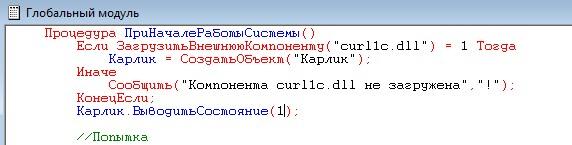 Хотя, ВК не выгружается - Сервис.ВыгрузитьВнешнююКомпоненту("curl1c.dll"); отрабатывает, в попытке, в исключение не падает, но ВК остается в памяти - добавил процедуру проверки: