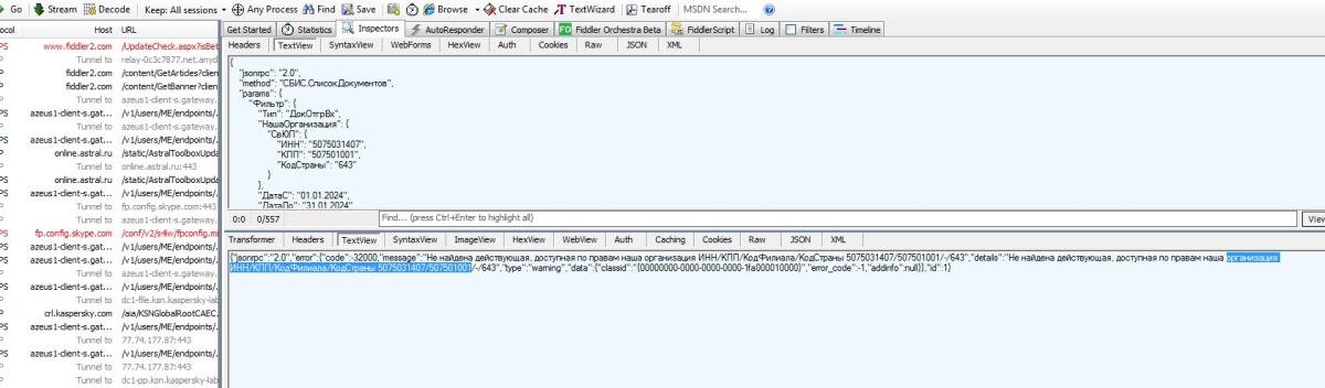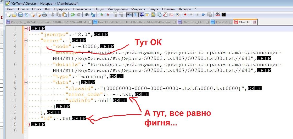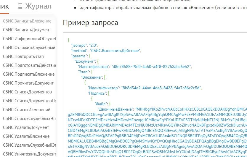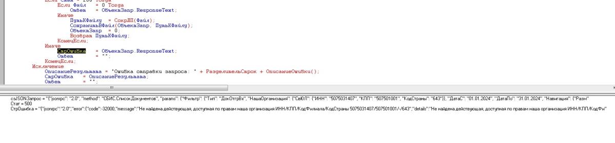 Начало тут: Падает "карлик" при выводе результата..., начиная с сообщения 116: "Решил - а почему-бы так-же, как у меня ЭДО лайт сделан, СБИС туда не вкорячить? Пока авторизацию и получение токена сделал, без их компоненты СДК, просто на https запросе, через карлика естественно :-) Теперь надо придумать, как документы потестить(у меня там нет ничего естественно, я его только сегодня зарегил), есть свой аккаунт Диадока, но тариф бесплатный, и даже хоть и есть на нем 50 исходящих в квартал, можно было-бы самому себе что-нибудь послать, но по роумингу скорее всего не отправит, эта фишка доступна только на платных тарифах..." На текущий момент сделана авторизация, получение ID сессии по КЭП, все работает: ![]() А вот дальше - застрял... Целый день сегодня бьюсь, и не в какую... Пытаюсь получить список документов с сервера, сам запрос такой: ![]() Отличий не вижу, кроме параметра - у них в примере даты, у меня тип документов(по талмуду только он обязательный, остальные можно опустить). Получаю в ответе: "Ошибка {"jsonrpc":"2.0","error":{"code":-32700,"message":"","details":"Error while decoding the request","type":"error","data":{"classid":"{f4101a18-9ea7-447d-9f98-9a951643f9f0}","error_code":-1,"addinfo":null}},"id":null}" Типа ошибка декодирования запроса... Кодировки запроса пробовал и в UTF-8 и в Windows-1251, разницы в ошибке нет... Не понимаю, что я не так делаю... Кто разбирался с этим, подскажите, дайте толчек, дальше я уже сам как нибудь :-) |