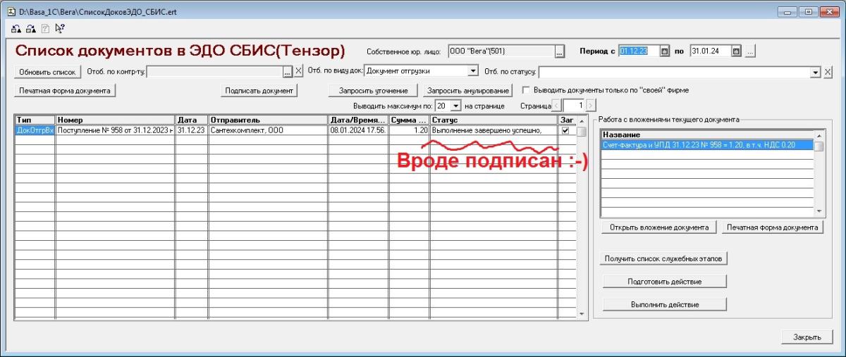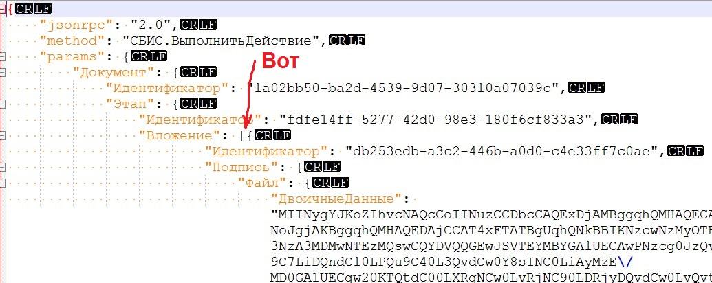 Когда стандартный входящий документ, например УПД или накладная, с одним вложением - все хорошо, нет проблем, все подписывается(Утверждается в их терминах), или отклоняется(Создается запрос уточнения). Но, как только документ содержит несколько вложений ПЕРВИЧНЫХ ДОКУМЕНТОВ - например, три - Счет, Акт вып. работ, и СчетФактура, то хотоь ты тресни, при попытке выполнить действие, возвращается ошибка: "{"jsonrpc":"2.0","error":{"code":-32000,"message":"При закрытии события на утверждение возникла ошибка:\nНет подписи под первичным документом (ON_SCHET___20220305_64e422e0-d807-4785-9b2c-47d3513a55f1) с идентификатором - e2f7d8e2-e56c-4547-a05f-21d46eec5c61","details":"При закрытии события на утверждение возникла ошибка:\nНет подписи под первичным документом (ON_SCHET___20220305_64e422e0-d807-4785-9b2c-47d3513a55f1) с идентификатором - e2f7d8e2-e56c-4547-a05f-21d46eec5c61","type":"warning","data":{"classid":"{00000000-0000-0000-0000-1fa000100000}","error_code":-1,"addinfo":null}},"id":1}" Что значит нет подписи??? Все я подписываю, каждое вложение из прилетевшего от них дока-ответа на запрос "Подготовки действия", в том числе и этот пресловутый счет, все ЭЦП вложений валидны, проверил, и передаю строками "двоичных данных" в запрос выполнения действия... Во вложении файлы: PodgEtap_1a02bb50-ba2d-4539-9d07-30310a07039c.txt - подготовленный этап, то, что "прилетело от них". ТелоЗапрВыпДействие.txt - Запрос, который я отправляю на последнем этапе выполнения действия. ВыпДействиеКарл.txt - ответ сервера на этот запрос Так-же, там в отдельных подкаталогах сами вложения с их ЭЦП и протоколами их проверки. Вроде все красиво, но не работает... Убей, не пойму, что я не так делаю? Архив со всеми файлами: https://cloud.mail.ru/public/tCFp/UAStXN7ny Сам алгоритм подписания, и все средства для этого - нормальные, рабочие, ведь если одно вложение, то все отрабатывает... Проблема похоже в том, что чего-то не хватает, каких-то вложений-титулов нет в ответе сервера на запрос СБИС.ПодготовкаДействия... Техподдержка пока молчит :-( |