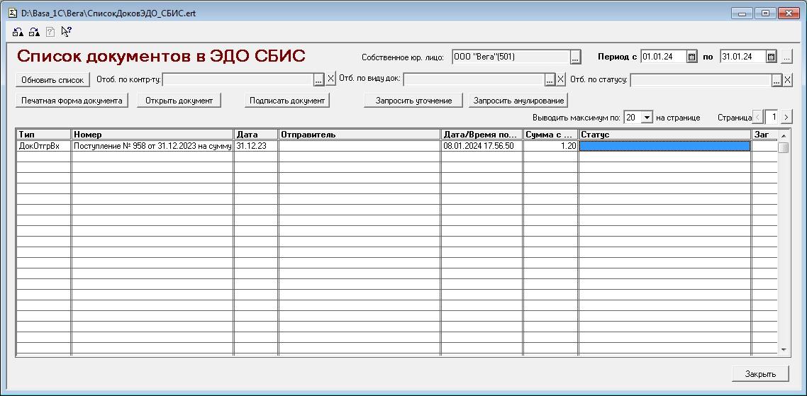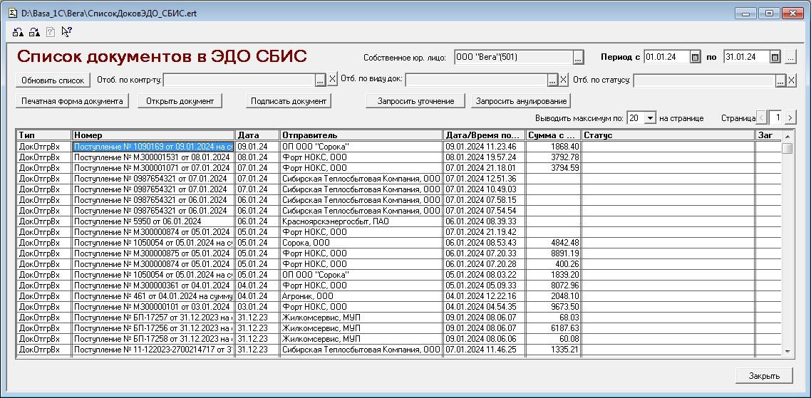Но, нет... Через API так не заработало... Ошибки не пишет, но и список пустой, ни одного документа в отбор не попадает, если делаю так: Фильтр.ДобавитьЗначение("ДокОтгрВх,CorrIn,АктСверВх", "Тип"); Если вставляю Ваши значения, так: Фильтр.ДобавитьЗначение("УпдСчфДоп,УкдКсчфДис,СчФктр,ЭДОНакл,счФактКор", "Тип"); То ошибка: "Указан неизвестный тип документа 'УпдСчфДоп'" Так: Фильтр.ДобавитьЗначение("ДокОтгрВх", "Тип"); работает, один документ у меня там есть, его показывает. Т.Е, значения из моего списка он понимает, но не выводит по ним, когда их больше одного, а Ваши значения ему совсем не известны в этом месте, первое видит и выводит ошибку, что оно ему не известно. |