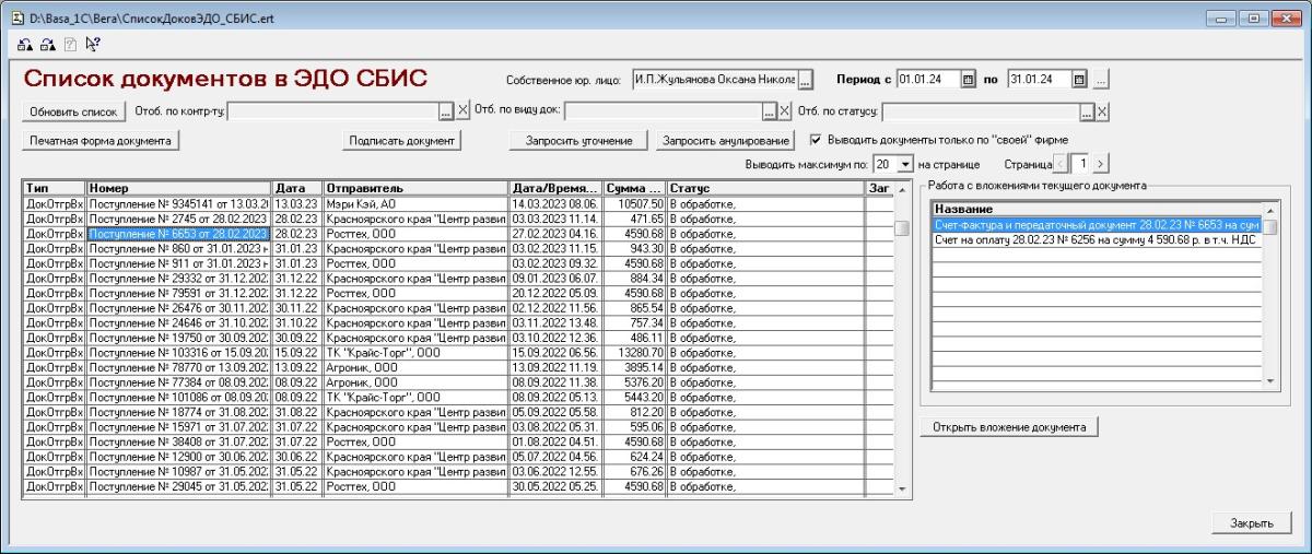 Вообще, конечно, сильно концепция ЭДО СБИС отличается от концепции ЭДО лайт от ЦРПТ... В ЭДО лайт, JSON списка проще, но, там все нужно получать запросами - сами документы в XML, печатные формы в PDF, и т.п... Сдесь же, можно тоже так-же, отдельными запросами, а можно просто получать их по ссылкам - все ссылки есть в JSON списка... Пока не решил, что лучше, и как буду делать дальше...