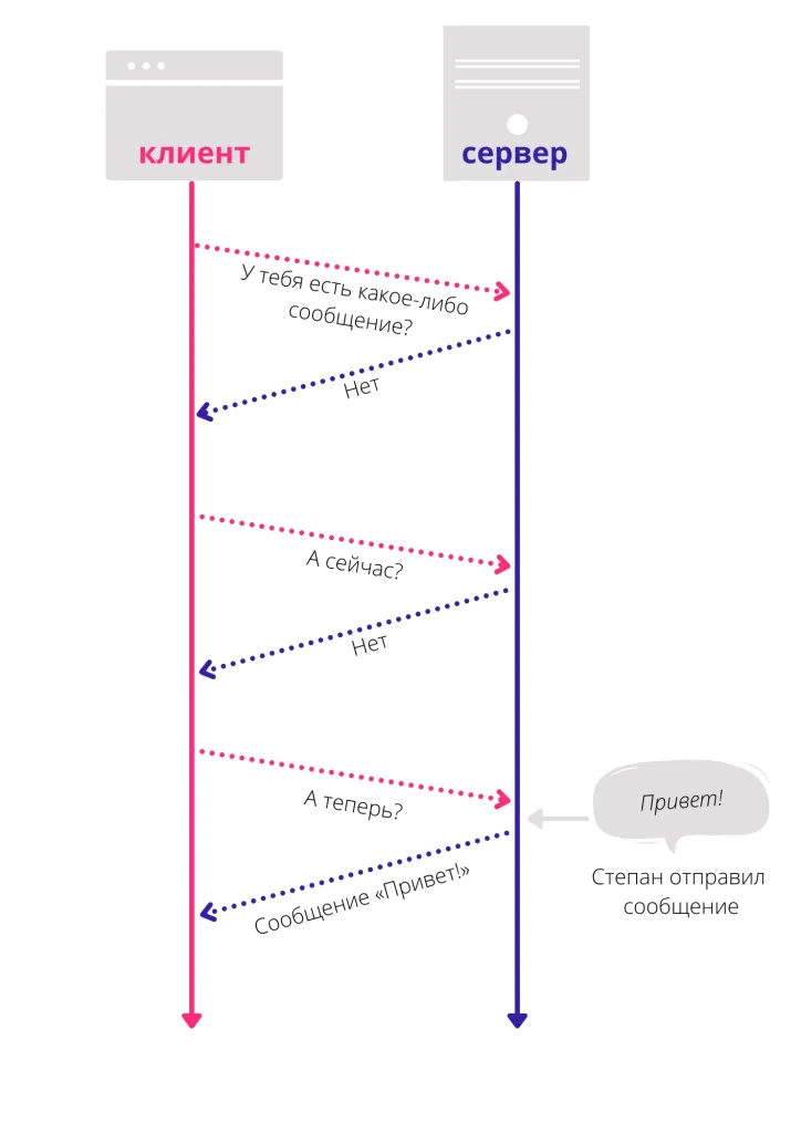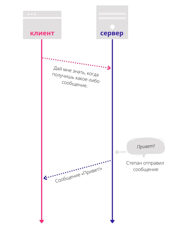 Он устанавливает одно соединение и передаёт ответ на единственный запрос в тот момент, когда ответ появился — без дополнительных запросов, как у HTTP-протокола. Запросы и ответы приходят без задержек и сетевой нагрузки.