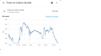 Отметка на уровне 1400 ppm – предел допустимого содержания углекислого газа в помещении. Если его больше, то качество воздуха считается низким.