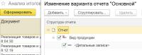 Добрый день. Столкнулся с проблемой. Нужно открыть отчет скд где данные берутся из тз. Создаю свою форму, ловлю параметр и кидаю его в объект отчета. В ПриКомпоновкеДанных подставляю его и формирую результат - все корректно работает. Но пользователю необходимо дать возможность менять структуру отчета. Так как у меня своя форма, то и форму настроек приходится использовать вспомогательную. Там структуры нету. Можно все менять через "изменить вариант", но все изменения в варианте не отображаются в результате. выходят только детальные записи, как в конфигураторе забито.