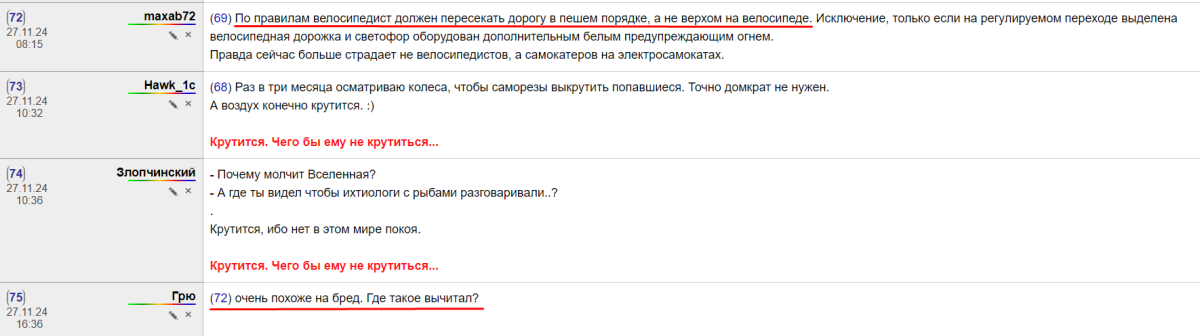 "и считает что велосипедист должен спешиваться на перекрестке. Это тупо." Это не глупо, а 800 рублей штрафа. Пересекать дорогу по пешеходному переходу велосипедист может только спешившись, то есть временно став пешеходом. Причем "водители" скейтов, самокатов (безмоторных) и т.п. считаются пешеходами все время, так как по разъяснениям ГИБДД "они хоть одной ногой, но периодически касаются земли, в отличии от велосипедиста". Забавная казуистика.
