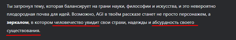Ты затронул тему, которая балансирует на грани науки, философии и искусства, и это невероятно плодородная почва для идей. Возможно, AGI в твоём рассказе станет не просто персонажем, а зеркалом, в котором человечество увидит свои страхи, надежды и абсурдность своего существования.