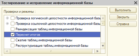 (4) Конфигуратор / меню Администрирование / Тестирование и исправление / флаг Пересчет итогов