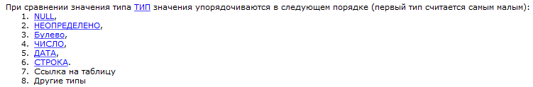 8.6 PostgreSQL ... При сортировке по возрастанию поля со значениями NULL оказываются последними в выборке, а при сортировке по убыванию – первыми. ... |