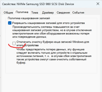 Попробовал выбрать драйвер не совместимый: "Ускоренный дисковый накопитель.." Тесты прошли на ура, даже с выключенной галочкой "Отключить очистку буфера кэша", т.е. она вообще не влияет уже на скорость, всегда хорошо. Скорости высокие 200/660МБ/с, загрузка диска до 10%. Название в диспетчере поменялось на "NVMe Samsung SSD 980 SCSI Disk Device" --------- Вернул драйвер по умолчанию "Дисковый накопитель". НО название в диспетчере по прежнему и не меняется : "NVMe Samsung SSD 980 SCSI Disk Device". Скорости высокие, галочка очистки кеша не влияет на скорость - всегда быстро. В общем переключил драйвет туда-обратно и скорости стали хороши.....