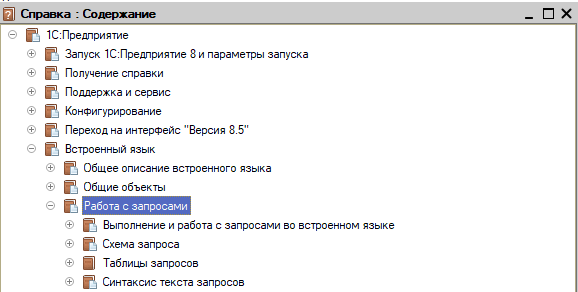 (9) Конфигуратор / Справка / Содержание справки / Встроенный язык / Работа с запросами